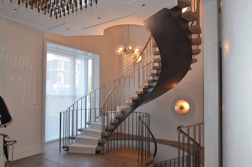 Three sweeping silver staircases unite this prime residential property in Notting hill. The stairs are self-supported by large central spines with smooth steel soffits, painted to produce an aged silver effect.