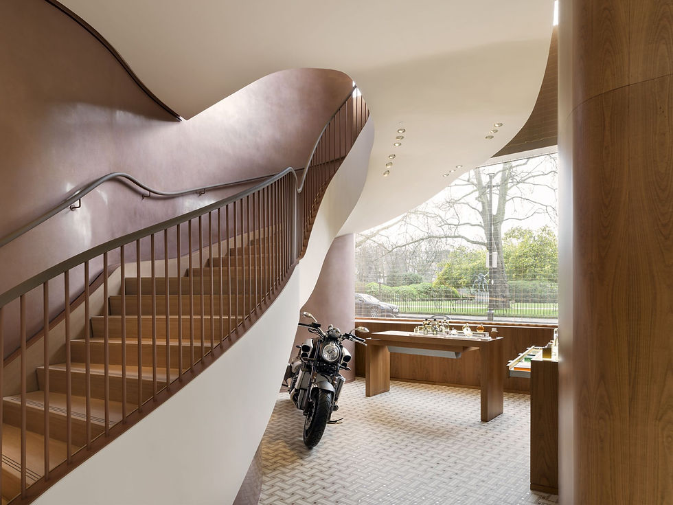 Designed by renowned architects and interior design specialists, RDAI, this Hermès boutique unfolds over two floors, which are united by a grand, undulating staircase, perhaps deliberately curved to temper the building's strict, 1950's angles.